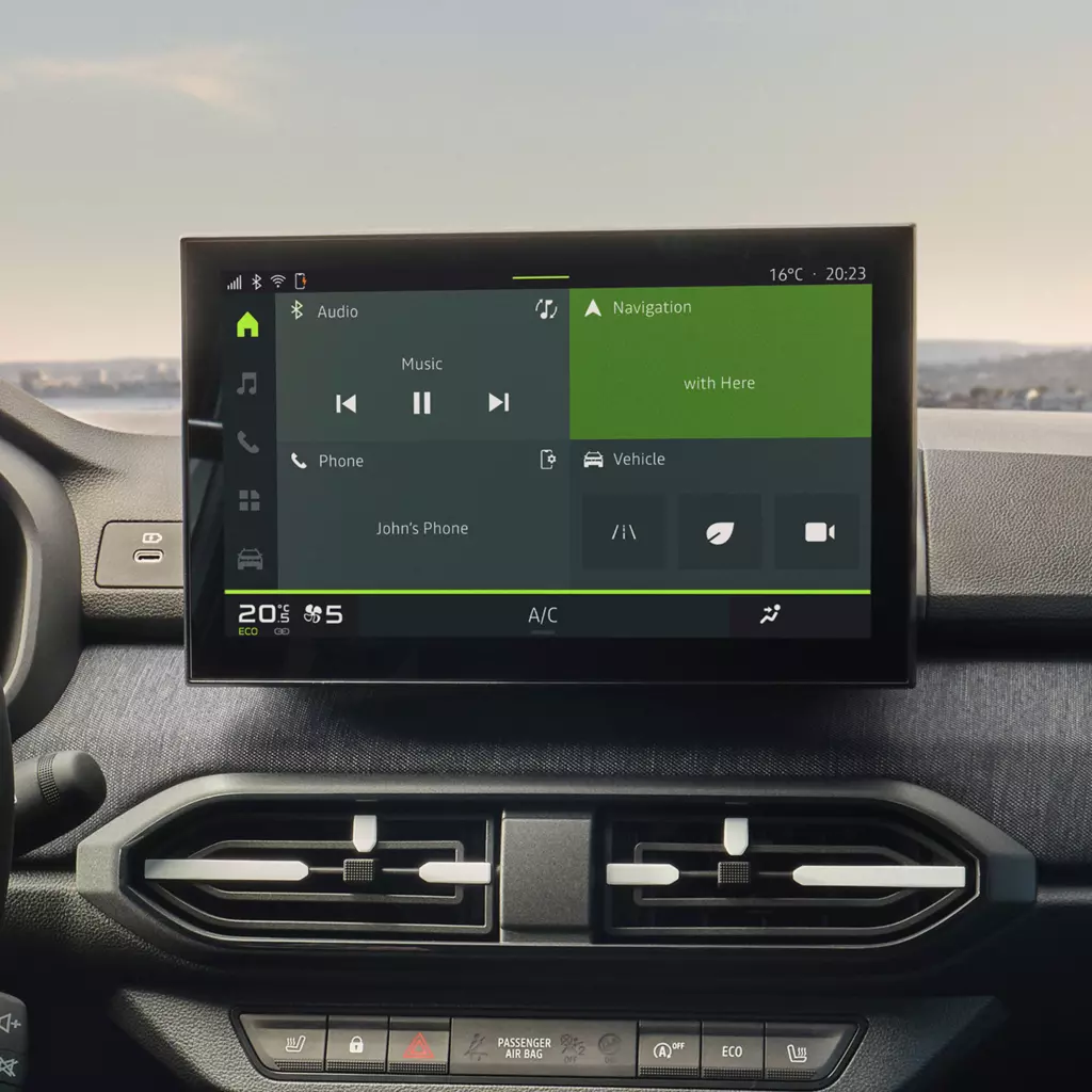 La modernización del habitáculo se refleja en sus tecnologías: una pantalla central de 10” (25,4 cm) con navegación conectada, un cuadro de instrumentos digital de 7” (17,78 cm) de lectura clara y el sistema de sonido 3D Arkamys®, que mejora la experiencia acústica. Todo está orientado a ofrecer una conducción intuitiva y actual.
